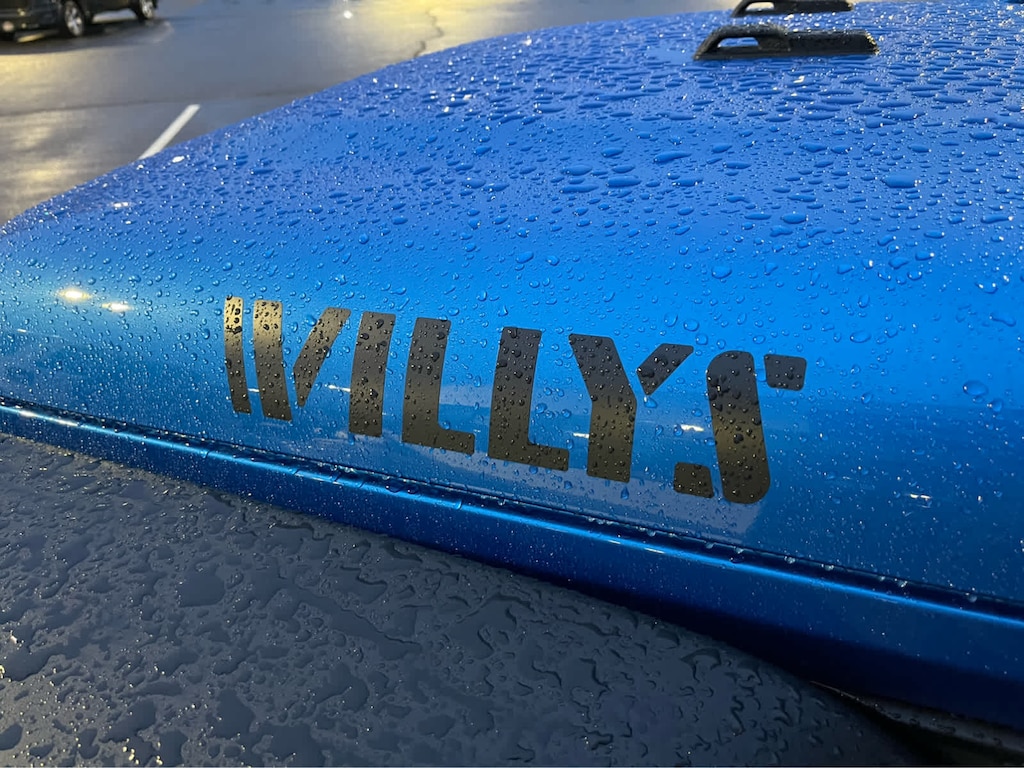 QUICK ORDER PACKAGE 22W WILLYS 2.0L I4 DOHC DI Turbo Engine w/ESS, 8-Speed Automatic 850RE Transmission, 7 & 4 Pin Wiring Harness, Conventional Differential Front Axle, 4-Wheel Drive Swing Gate Decal, Black Grille, Injection Molded Black Rear Bumper, Dana M210 Wide HD Tube Front Axle, Daytime Running Lamps LED Accents, Front LED Fog Lamps, LED Premium Reflector Headlamps, E-Locker Rear Axle, Corning Gorilla Glass, Security Alarm, Class II Receiver Hitch, Mold In Color Bumper w/Gloss Black, Advanced Brake Assist, Automatic Headlamps, Off-Road Plus Mode, Willys Hood Decal, Full Speed Forward Collision Warning Plus, Rock Protection Sill Rails, Power Heated Mirrors, Enhanced Adaptive Cruise Control, Auxiliary Switches, Dana M220 Wide Rear Axle, Molded in Color Rubicon Highline Flare, Premium, XTREME 35 TIRE PACKAGE LT315/70R17C 113/110S Tires, Wheel Flare Extensions, MOPAR Tire Relocation Kit, Anti-Lock 4-Wheel Disc Perf Brakes, 17 x 8 Machined Wheels w/Black Pockets, 4.56 Rear Axle Ratio, Injection Molded Black Rear Bumper, Delete 4-Wheel Drive Swing Gate Decal, 35 Tire Suspension, MOPAR Hinge-Gate Reinforcement, MOPAR Jack Spacer, Molded in Color Rubicon Highline Flare, 6,250 lbs GVWR, 8-SPEED AUTOMATIC 850RE TRANSMISSION Adaptive Cruise Control w/Stop, Anti-Lock 4-Wheel Disc Brakes, Integrated Radar Camera Module (IRCM), Dana M200 Rear Axle, Selec-Speed Control, BLACK 3-PIECE HARD TOP Freedom Panel Storage Bag, Rear Window Defroster, Rear Window Wiper/Washer, CONVENIENCE GROUP Emergency/Assistance Call, 2-Door Passive Entry, Front Door Locks, Cluster 7.0 TFT Color Display, Universal Garage Door Opener, Heated Front Seats, Air Conditioning w/Auto Temp Control, Heated Steering Wheel, Air Filtering, 2.0L I4 DOHC DI TURBO ENGINE W/ESS. Jeep Willys with Hydro Blue Pearlcoat exterior and Black interior features a 4 Cylinder Engine with 270 HP at 5250 RPM*.