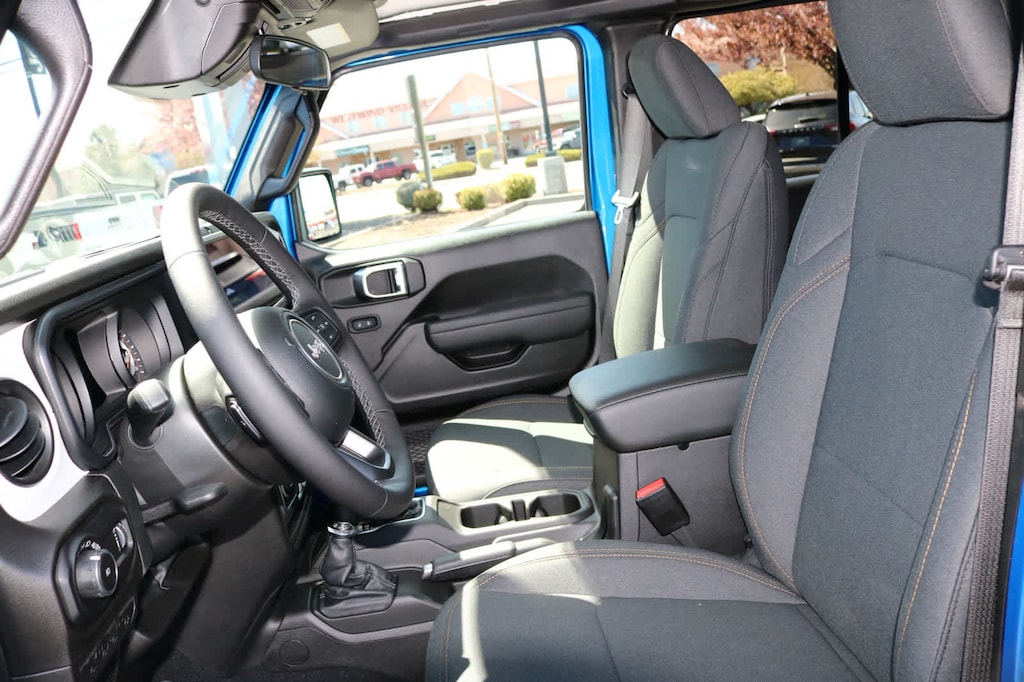 8-SPEED AUTOMATIC 850RE TRANSMISSION Adaptive Cruise Control w/Stop, Anti-Lock 4-Wheel Disc Brakes, Dana M200 Rear Axle, Selec-Speed Control, QUICK ORDER PACKAGE 24S SPORT S 3.6L V6 24V VVT UPG I Engine w/ESS, 8-Speed Automatic 850RE Transmission, Advanced Brake Assist, Power Heated Mirrors, Enhanced Adaptive Cruise Control, Automatic Headlamps, Corning Gorilla Glass, Premium Wrapped Steering Wheel, Security Alarm, Sun Visors w/Illuminated Vanity Mirrors, Full Speed Forward Collision Warning Plus, BLACK 3-PIECE HARD TOP Freedom Panel Storage Bag, Rear Window Defroster, Rear Window Wiper/Washer, No Soft Top, CONVENIENCE GROUP Emergency/Assistance Call, 2-Door Passive Entry, Front Door Locks, Cluster 7.0 TFT Color Display, Universal Garage Door Opener, Heated Front Seats, Air Conditioning w/Auto Temp Control, Heated Steering Wheel, Air Filtering, 17 X 7.5 GRAY WHEELS (STD), LED HEADLAMP & FOG LAMP GROUP Front LED Fog Lamps, LED Premium Reflector Headlamps, 3.6L V6 24V VVT UPG I ENGINE W/ESS Engine Oil Cooler (STD). Jeep Sport S with Hydro Blue Pearlcoat exterior and Black interior features a V6 Cylinder Engine with 285 HP at 6400 RPM*.