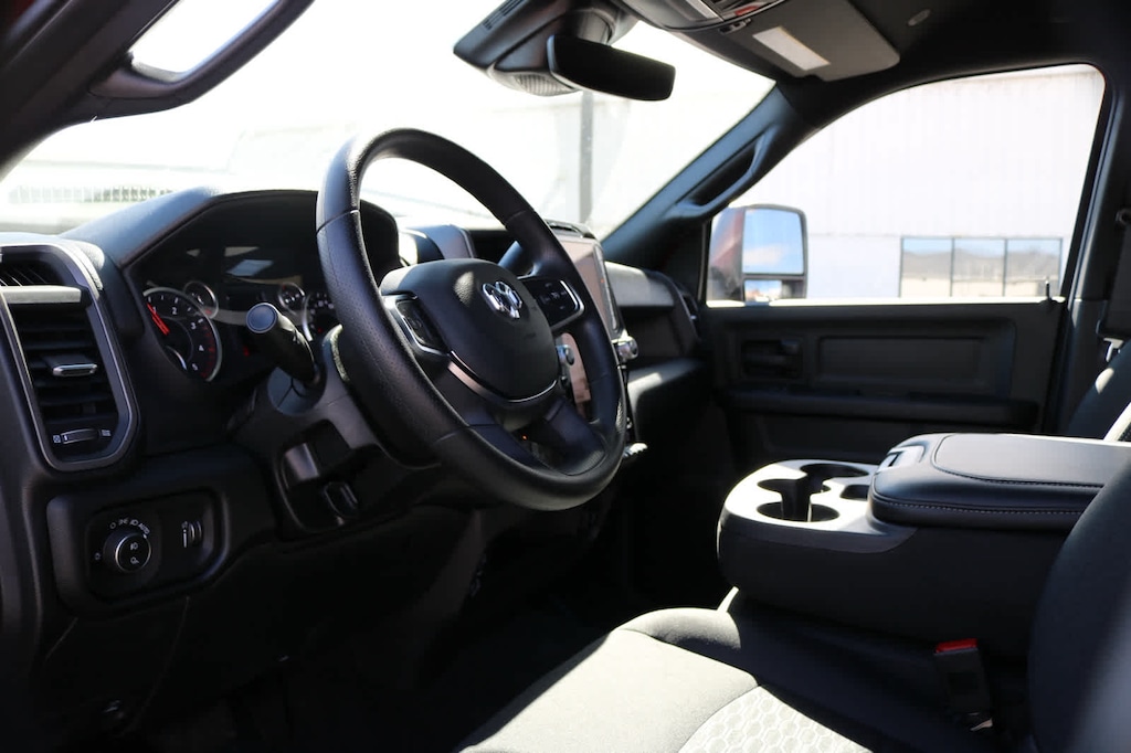 TRADESMAN LEVEL 2 EQUIPMENT GROUP Convenience Group, Emergency Vehicle Alert System (EVAS), 12 Touchscreen Display, Anti-Spin Differential Rear Axle, Mirror Running Lights, Exterior 115V AC Outlet, Alexa Built-In, Power-Adjustable Convex Aux Mirrors, Disassociated Touchscreen Display, Matte Black Mesh Grille w/Chrome, 115V Auxiliary Front Power Outlet, Center Hub, Tires: LT275/70R18E BSW AS, Rear View Auto Dim Mirror, Rear Power Sliding Window, Tinted Acoustic Windshield Glass, GPS Navigation, Bright Rear Bumper, Exterior Mirrors w/Heating Element, Chrome Grille Surround, MOPAR Black Tubular Side Steps, SiriusXM w/360L, Connected Travel & Traffic Services, Wheels: 18 x 8.0 Steel Chrome Clad, Carpet Floor Covering, Off-Road Info Pages, Trailer Tow Pages, 400W Inverter, HD Radio, Power, BED CONVENIENCE GROUP MOPAR Spray In Bedliner, LED Bed Lighting, TRANSMISSION: 8-SPEED TORQUEFLITE HD AUTOMATIC, BLACK, CLOTH 40/20/40 BENCH SEAT. Ram Tradesman with Molten Red Pearlcoat exterior and Black interior features a Straight 6 Cylinder Engine with 405 HP at 5600 RPM*.