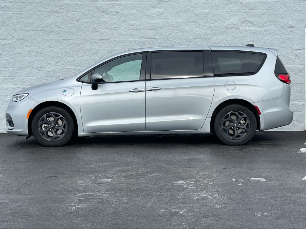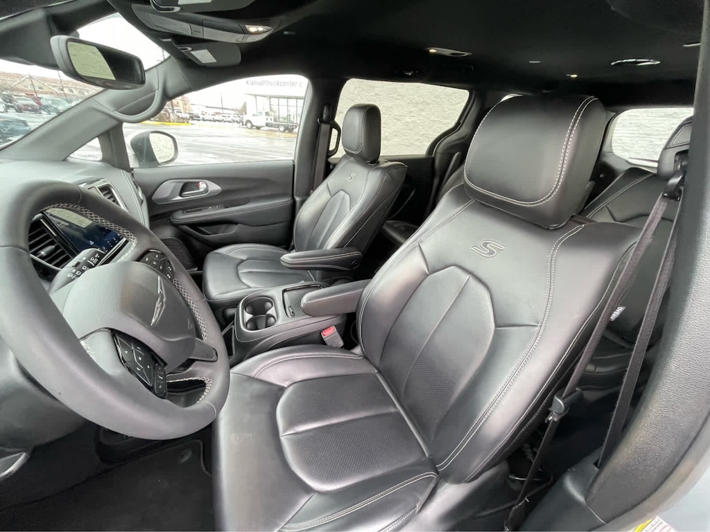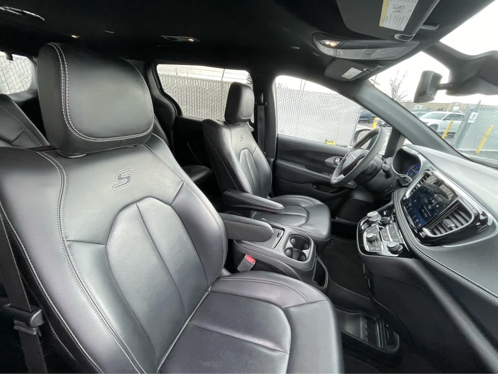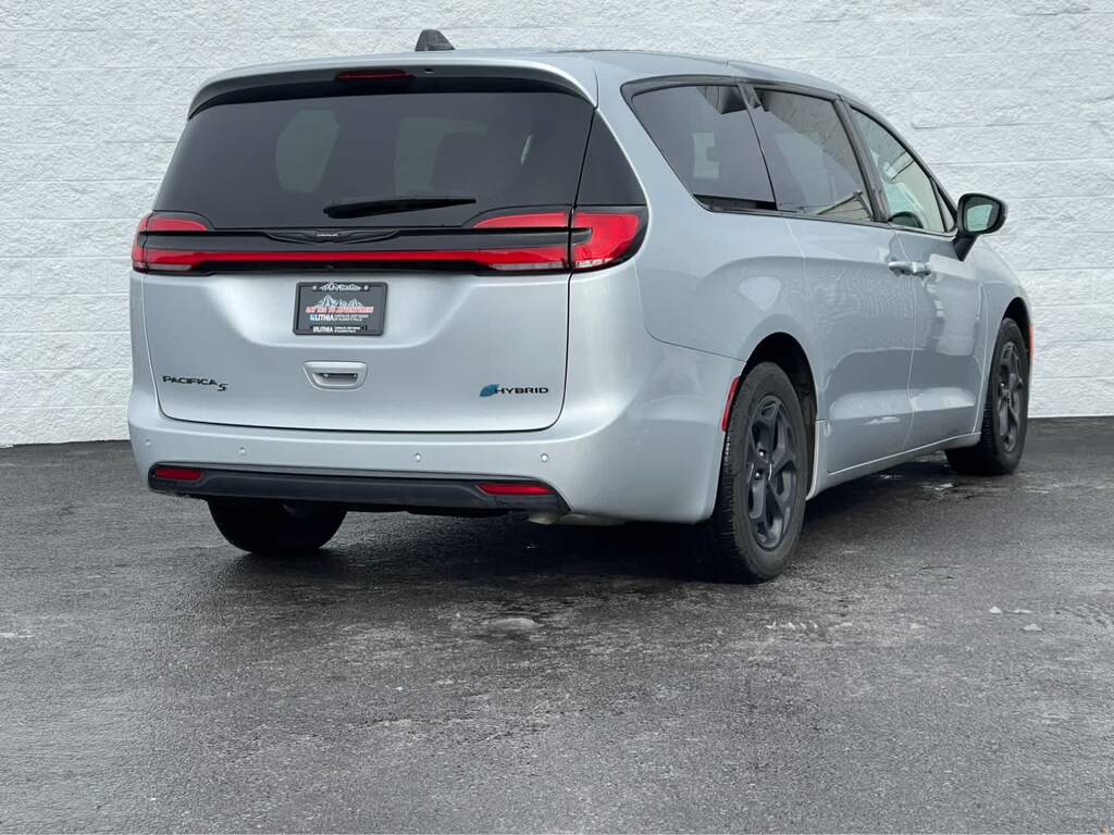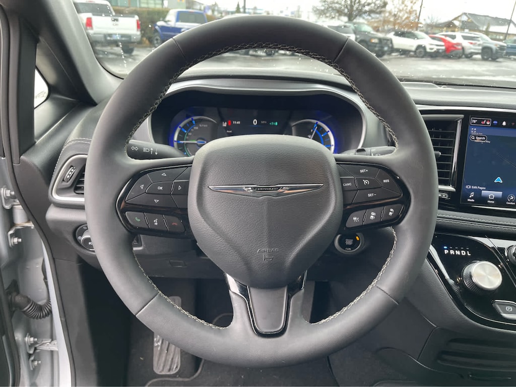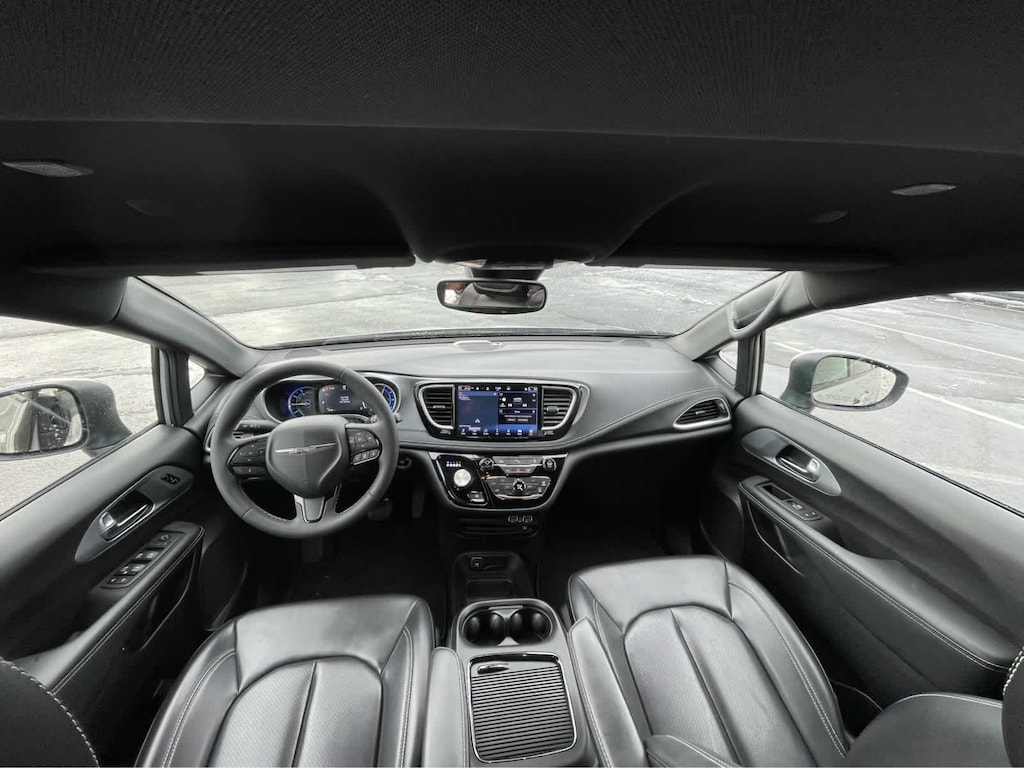 UCONNECT THEATER FAMILY GROUP Video USB Port, Rear View Auto Dim Mirror, For Details, Visit DriveUconnect.com, Integrated Voice Command w/Bluetooth®, Power 2-Way Passenger Lumbar Adjust, GPS Navigation, 506 Watt Amplifier, High Definition Multimedia Interface, Front Passenger Auto Advance N Return, SiriusXM w/360L, 3-Channel Video Remote Control, Seatback Video Screens, 3rd Row USB Charge Port, Front/Rear 1-Touch Up/Down Power Windows, FamCAM Interior Camera, Power Adjust 8-Way Front Passenger Seat, Amazon Fire TV Built-In, Radio: Uconnect 5 Nav w/10.1 Display, 13 Alpine Speakers, KeySense, HD Radio, SiriusXM Guardian - Included Trial (B), Global Telematics Box Module (TBM), 4G LTE Wi-Fi Hot Spot, Hands Free Sliding Doors, Hands Free Power Liftgate, 115V Auxiliary Power Outlet, S APPEARANCE PACKAGE Black Day Light Opening Moldings, Piano Black Interior Accents, Premium Fascia Upper/Lower Grille w/Black Surround, Premium Rear Fascia Black, Anodized Ice Cave Accents, Wheels: 18 x 7.5 S-Model Aluminum Design 3, Anodized Ink Badging, Tires: 235/60R18 BSW AS, S Badge, TRANSMISSION: EFLITE SI-EVT (STD), ENGINE: 3.6L V6 PLUG-IN HYBRID (STD). Chrysler Hybrid Touring L with Silver Mist Clearcoat exterior and Black interior features a V6 Cylinder Engine.